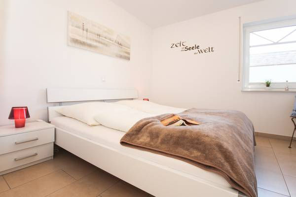 Im geräumigen Schlafzimmer befindet sich ein 1,80 x 2,00m großes Doppelbett mit verstellbarem Lattenrost und Kaltschaummatratze, ein Kleiderschrank, Nachtschränkchen und Radiowecker.
